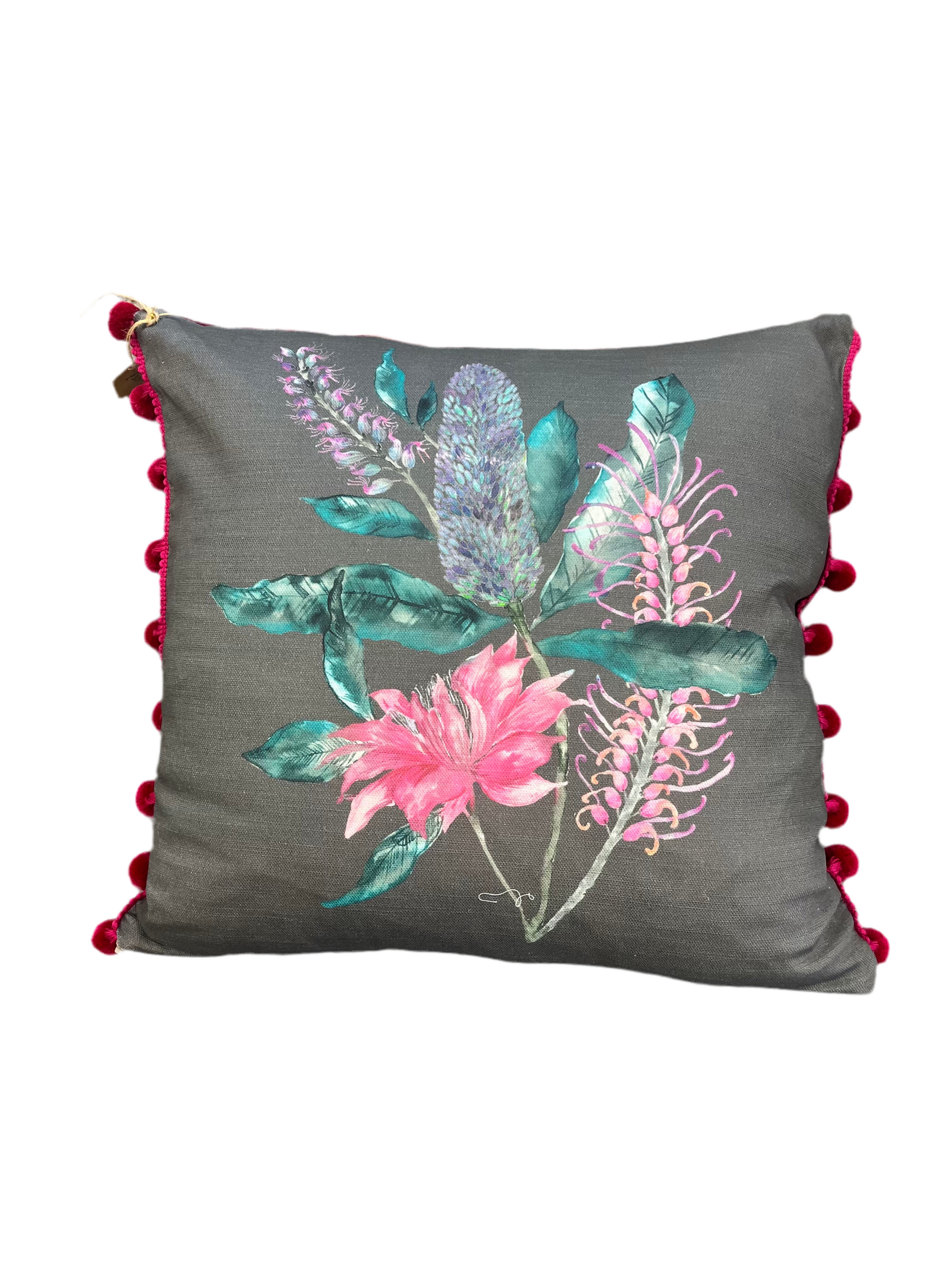 Floral Cushion Cover 40cm x 40cm With Beautiful Pink Pompom Trim And Velvet Backing